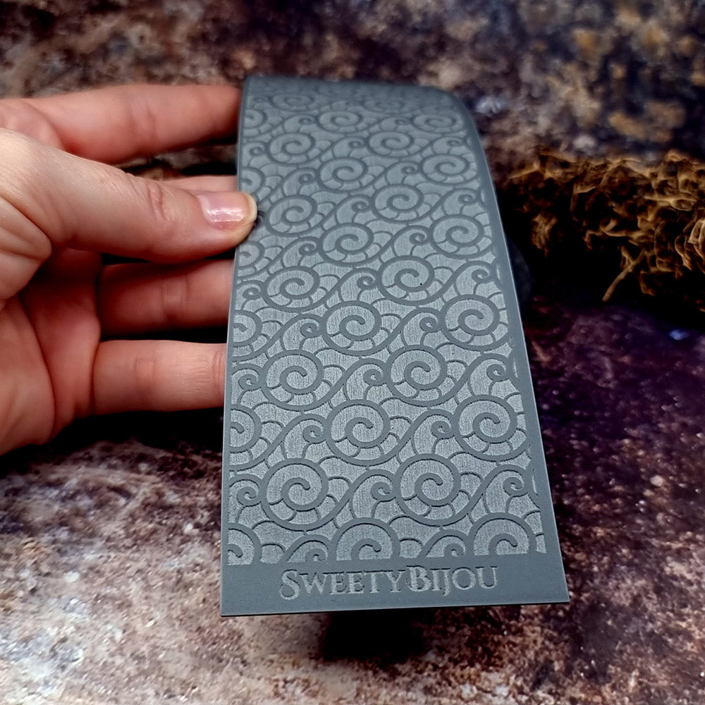 The "Ocean Pattern" rubber texture sheet is an artistic tool that captures the serene, rhythmic essence of the sea. This design is adorned with a continuous swirl pattern that mirrors the gentle, rolling waves of the ocean, providing a sense of movement and tranquility. The swirls are elegantly crafted to resemble the ebb and flow of tides, making it an ideal choice for creating jewelry that reflects the beauty of the marine environment.