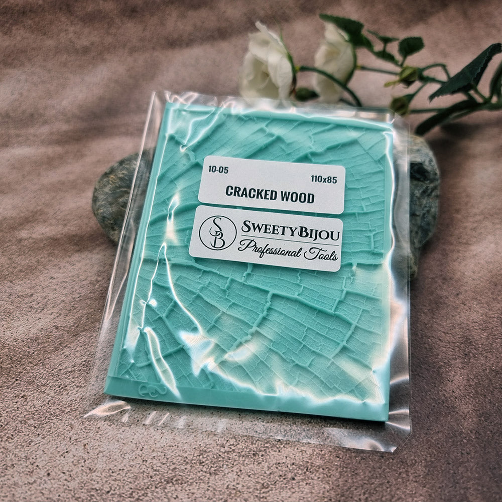 This handmade silicone texture creates a detailed “cracked wood” pattern with clean, crisp impressions. The flexible silicone does not require a release agent and is easy to use, especially with soft polymer clay. The texture can be baked at 150°C (302°F) and works well with all major clay brands.