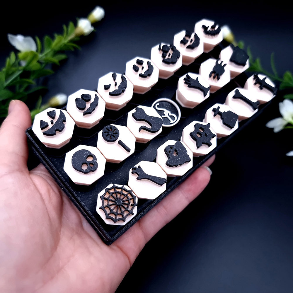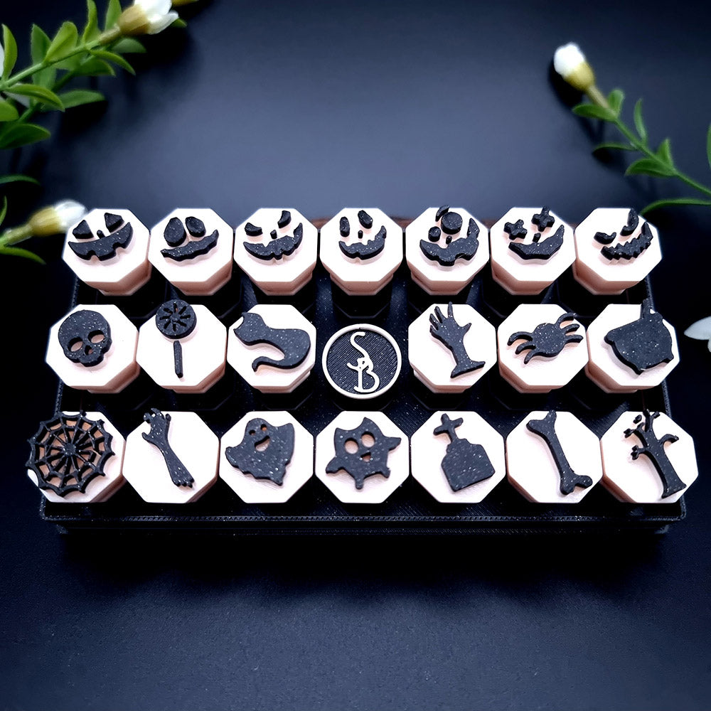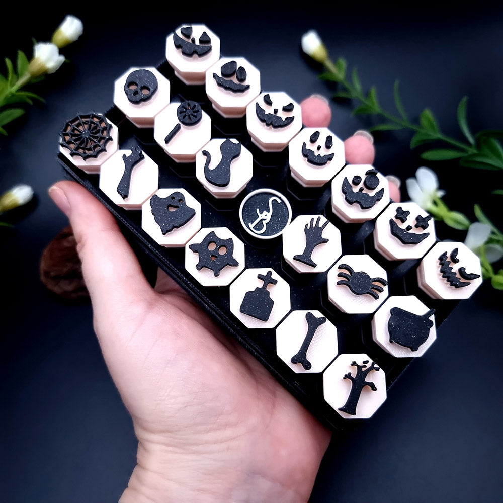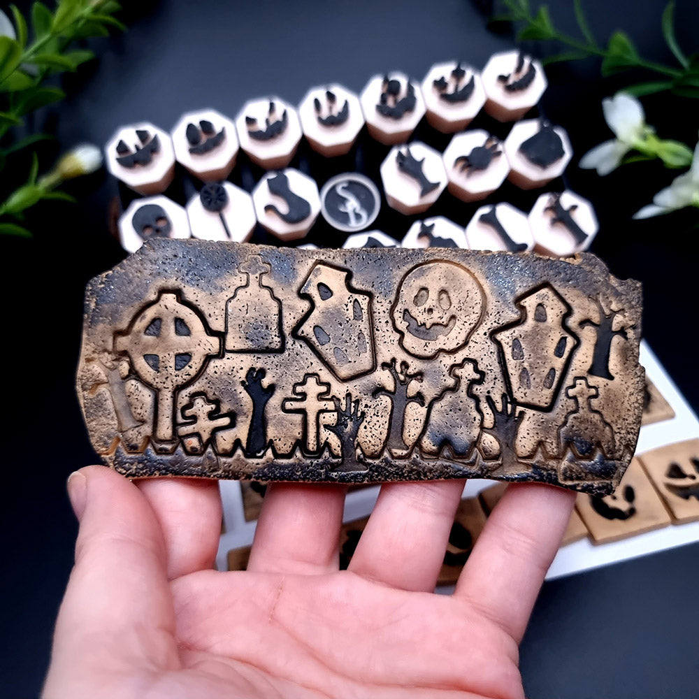 Spooky Night Halloween Set of Stamps, the perfect addition to your polymer clay and jewelry-making toolkit! This set features 20 meticulously crafted tiny stamps, each adorned with spooky elements to inspire your Halloween-themed creations. Packaged in a high-quality box, these stamps are perfect for adding intricate, fine-art details to your projects.