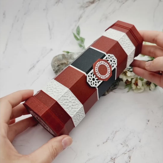 The case splits into two matching holders, perfect for organizing pens, pencils, markers, or brushes. Closed, it resembles an ancient scroll container - a tribute to knowledge, creativity, and craftsmanship.