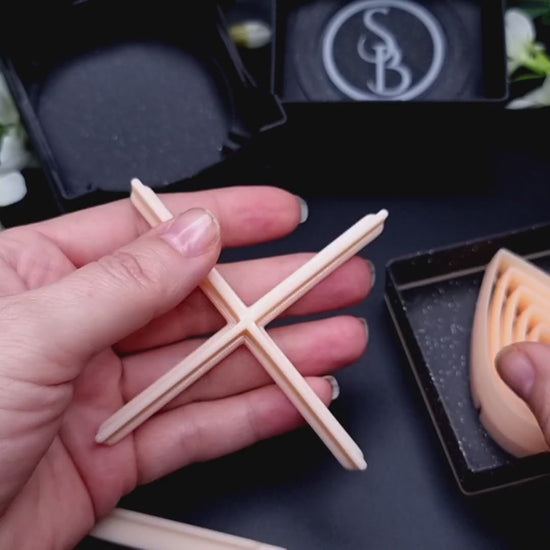 The set also contains two special holders: a straight stick and a cross. You can fix any number of cutters on these holders and make the same cuts as often as you like.