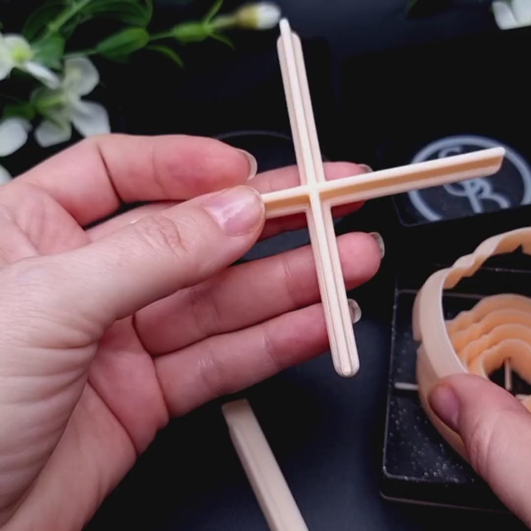 The set also contains two special holders: a straight stick and a cross. You can fix any number of cutters on these holders and make the same cuts as often as you like.