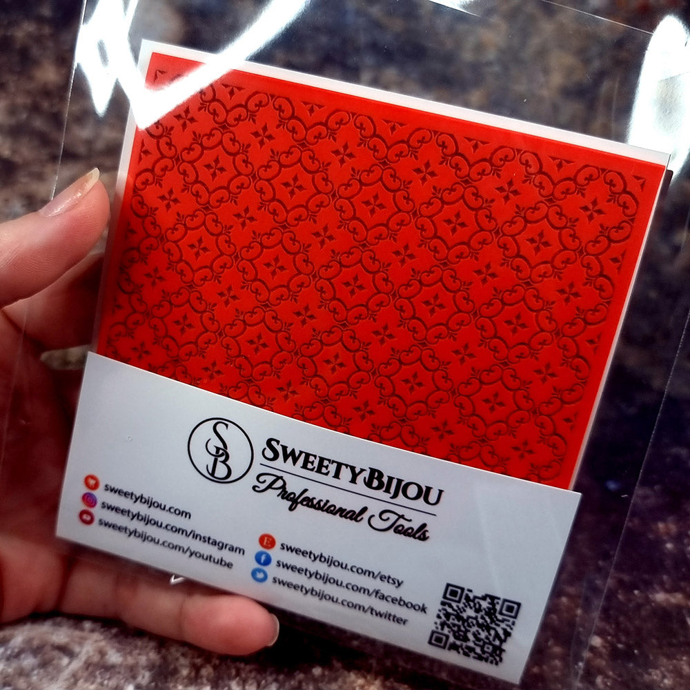 The rubber sheet is of premium quality, ensuring crisp, detailed impressions in polymer or metal clay, allowing jewelry makers to produce pieces with complex, ornate surface designs. The repetitive, lace-like pattern is ideal for creating sophisticated, eye-catching pieces that evoke the luxury and mystique of Moroccan aesthetics.