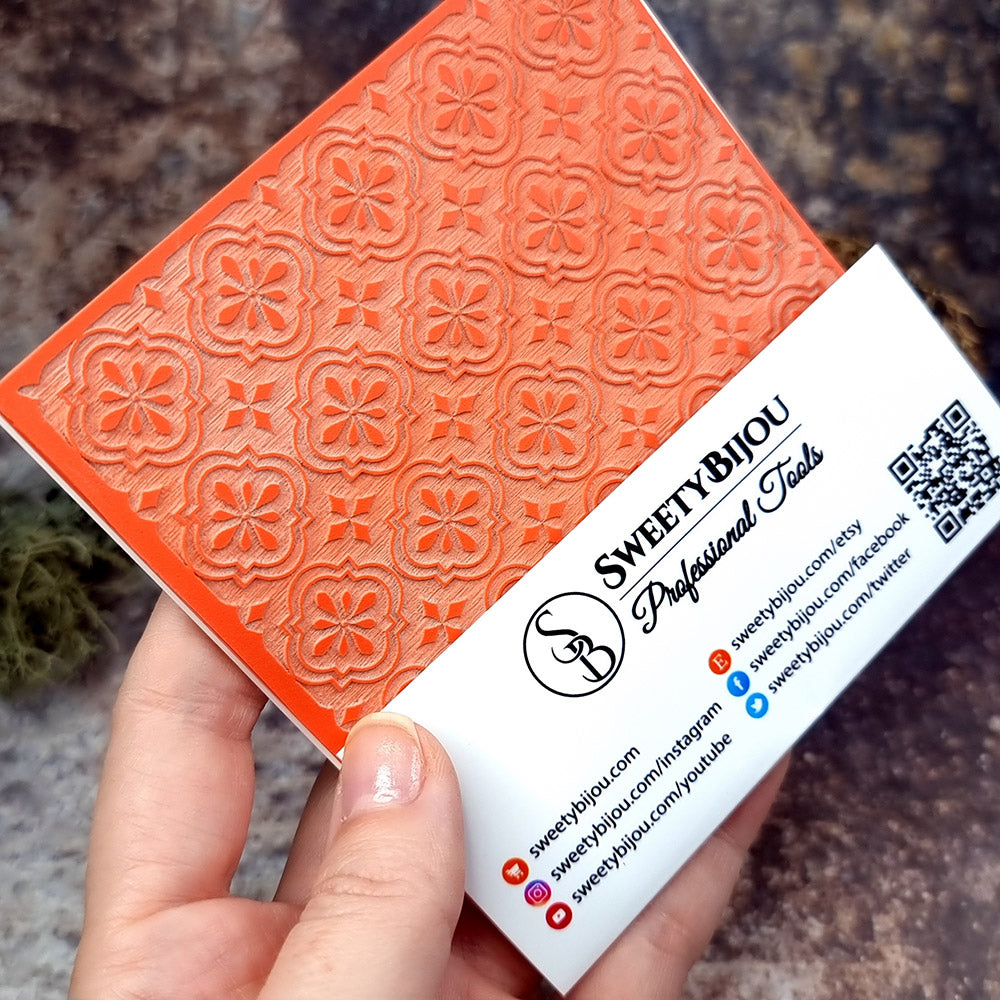 The "Moroccan Pattern 2" rubber texture sheet is a beautifully crafted tool for jewelry makers, offering a captivating design inspired by the rich heritage of Moroccan architecture and textiles. This pattern boasts a series of floral motifs arranged in a harmonious, tessellated design that is both bold and intricate.
